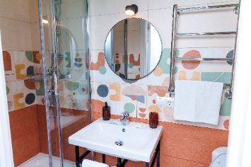 В номерах 1 этажа спокойный дизайн и обнаженная кирпичная кладка, у номера на 2 этаже наоборот яркий дизайн.